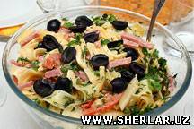 | Пишлокли салат Керакли махсулотлар: 1 булак рим салати, 1 та кизил булгор калампири, 1 та узун навли бодринг, 200 гр помидор, 1 бог кашнич, 2 та пиёз, 200 гр пишлок, 100 гр зайтун меваси, 100 мл зайтун мойи, 50 мл минерал сув, 2 ош кошик сирка, туз, майда мурч, шакар. Тайёрланиши: 1. Салат барглари булакчаларга булинади, калампир – кубик шаклида, бодринг – халкалар шаклида тугралади. Кашнич ювиб, куритилади, барглари юлиб олинади ва ширик чопилади. Пиёз тозаланиб, халка шаклида тугралади. 150 гр пишлок тугри туртбурчак шаклда тугралади. Махсулотларни идишдаги зайтун мевалар билан аралаштирилади. 2. Чучитиш учун зайтун мойи, пишлокнинг колгани, минерал сув ва сирка идишга солиниб, кремга ухшаш тусга киргунча аралаштирилади. Тузи ростланади, мурч ва шакар солинади. Салат усти таъбга караб безатилади.